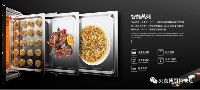 火鑫博厨集成灶颜值美观大气,用料扎实,做工精致,并且将油烟机、燃气灶、蒸箱集为一体,功能强大,一机多能。火鑫博厨集成灶机头部分为置物台,可以用来摆放调味品或者平板、手机,烹饪和娱乐同时兼顾;黑色镜面设计,质感出众,烟机控制模块位于机头正中间。‘’